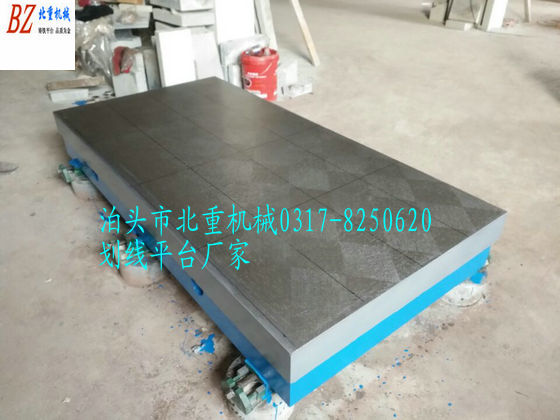鑄鐵劃線(xiàn)平臺鑄件成形后,進(jìn)行回火時(shí)效,目的是為了消除劃線(xiàn)平臺鑄件的內應力。然后經(jīng)刨床粗加工,刨去劃線(xiàn)平臺表面粗皮,獲得粗加工精度,然后再一次進(jìn)行回火時(shí)效,消除加工及劃線(xiàn)平臺殘余應力?;鼗鸷蠼?jīng)數控銑床加工表面,使劃線(xiàn)平臺精度達到規定要求,然后人工刮研排點(diǎn)。