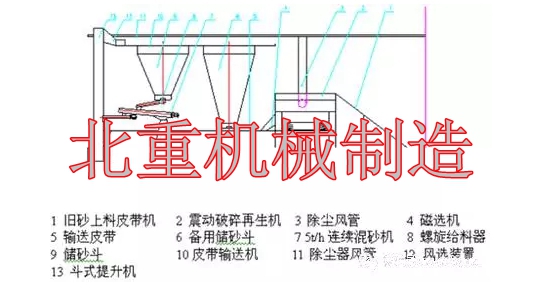 人工落砂后,舊砂通過(guò)上料皮帶機進(jìn)入振動(dòng)落砂機完成落砂、破碎、篩分,再生,經(jīng)過(guò)帶由磁選的輸送皮帶進(jìn)入斗式提升機,在輸送過(guò)程中人工加入新砂。在斗提的出口處安裝風(fēng)選裝置,經(jīng)過(guò)風(fēng)選的型砂經(jīng)皮帶輸送機進(jìn)入儲砂斗。劃線(xiàn)平臺鑄件生產(chǎn)時(shí),型砂從砂斗經(jīng)螺旋給料器進(jìn)入混砂機。